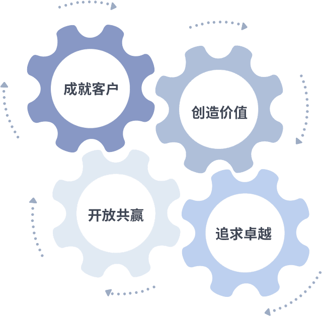 成就客户是一切决策的出发点,,,创造价值是衡量所有工作的标准,,,追求卓越是我们做事做人的态度,,开放共赢是我们的格局也是最终的结果。。。价值观的齿轮环环相扣,,,推动着组织里的每个人不断向前。。。